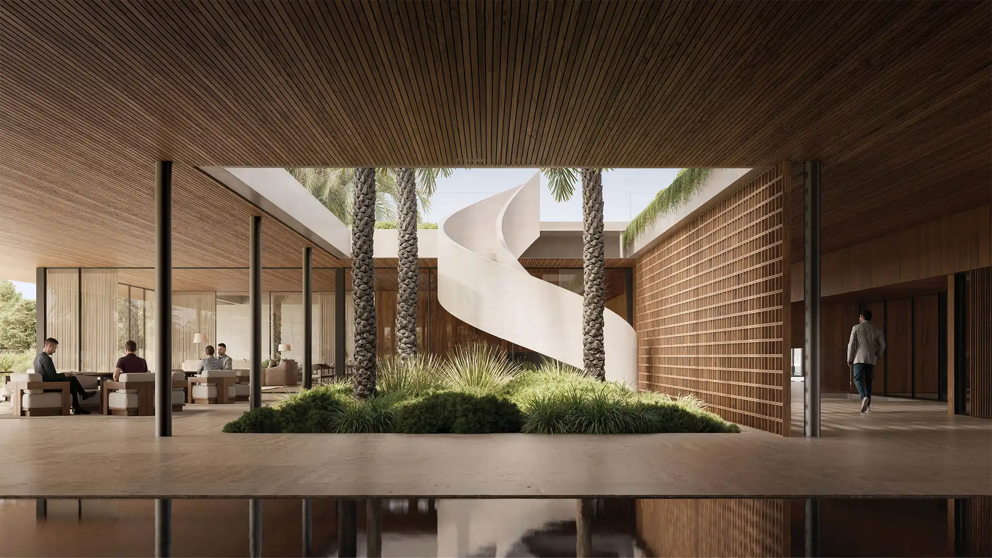 Flagship villa options include private swimming pools and 3-car garages. The interiors feature light tones, rich woods, decorative stone, natural textures, and soft textiles. Expansive panoramic windows frame views of polo fields, landscaped parkways, and private gardens, creating a refined yet effortless atmosphere.